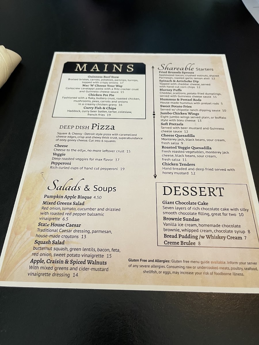 Start your meal with delightful soups and salads like the comforting Pumpkin Apple Bisque or the Roasted Squash Salad, which brilliantly combines butternut squash, lentils, and feta. For burger enthusiasts, the Dublin Burger and Hangover Burger are must-tries, showcasing savory flavors and creative toppings that promise a memorable bite.